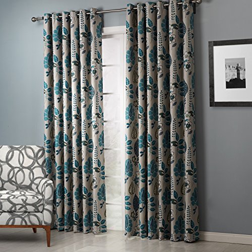 TWOPAGES Faux Linen Blue Leaf 90% Blackout Curtain Drapes Grommet(One Panel) 72Wx96